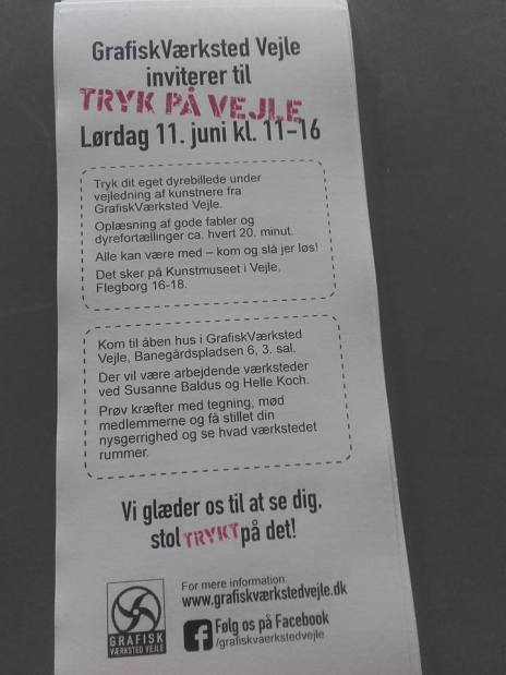 I forbindelse med fernisering af udstillingen Tryk på Vejle fejredes åbning af værkstedet. Tryk på Vejle blev støttet af: Billedkunstrådet Vejle med 12.000 kr. og af Nordentoft Wine.
